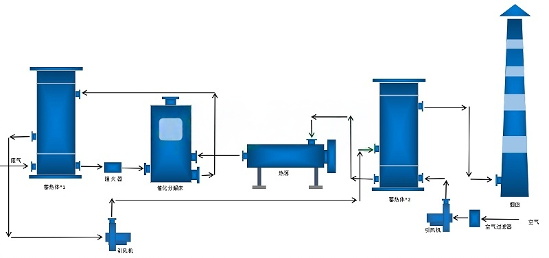 (1)废气经过换热器I,将温度从10℃提高至150℃。热源为催化分解装置反应后的高温气体(300-350℃)。温度回收利用,降低系统运行成本;