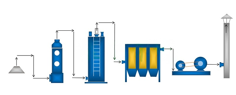 拟处理的垃圾废气考虑运营成本及安全性,工艺路线拟采用以“通风系统(管道、引风机)+ 预处理系统(净化塔)+脱白系统(电磁脱白设备)+深度净化系统(RTO)”为核心工艺来处理该废气。该工艺路线示意图如下: