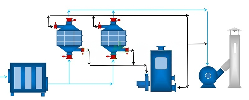 (2)完成解吸脱附以后活性炭吸附器Ⅰ进入待用状态,待活性炭吸附器Ⅱ接近饱和时,系统再自动切换回来,同时对活性炭吸附器 Ⅱ进行解吸脱附,如此循环工作。